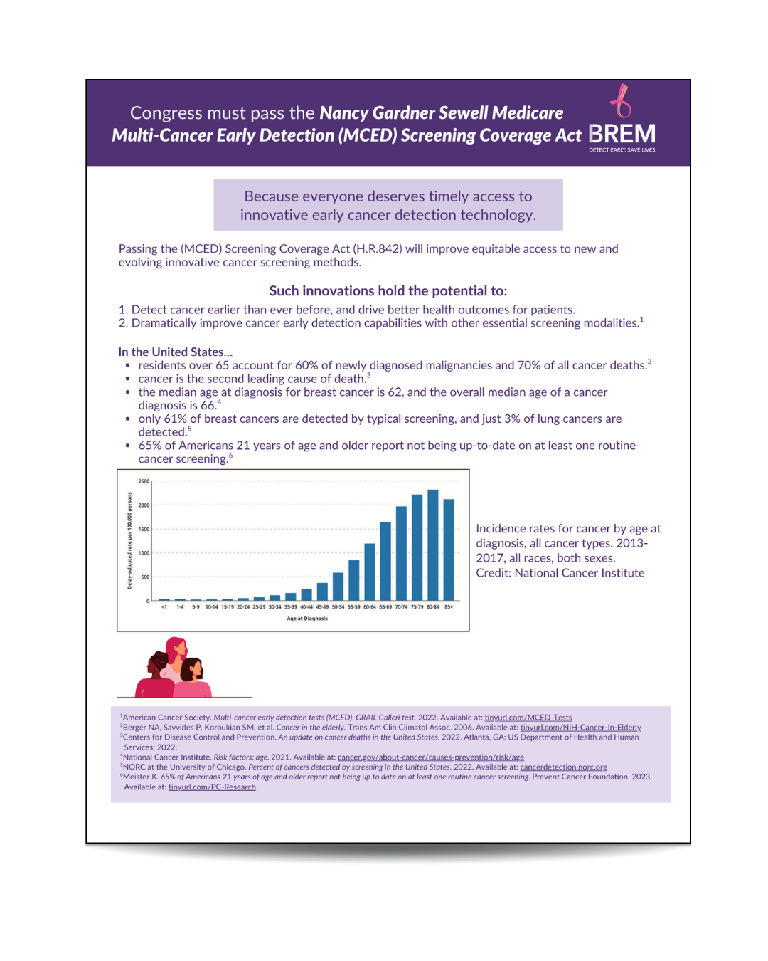 Passing the Nancy Gardner Sewell Medicare Multi-Cancer Early Detection (MCED) Screening Coverage Act will improve future equitable access to new and innovative cancer screening methods. Innovative blood tests—otherwise known as liquid biopsy— hold the potential to detect cancer earlier than ever before, while dramatically improving cancer detection capabilities.