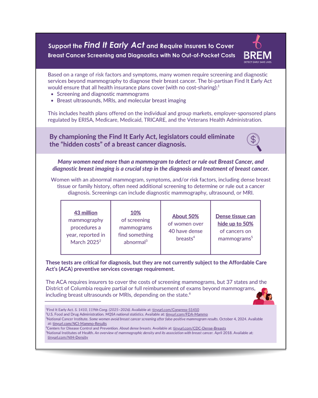 Early detection of breast cancer saves lives. At Brem Foundation, our focus is to ensure that early detection is a priority for leaders and stakeholders. Click the infographic below to see how we advocate for meaningful policy change in support of early detection of breast cancer.